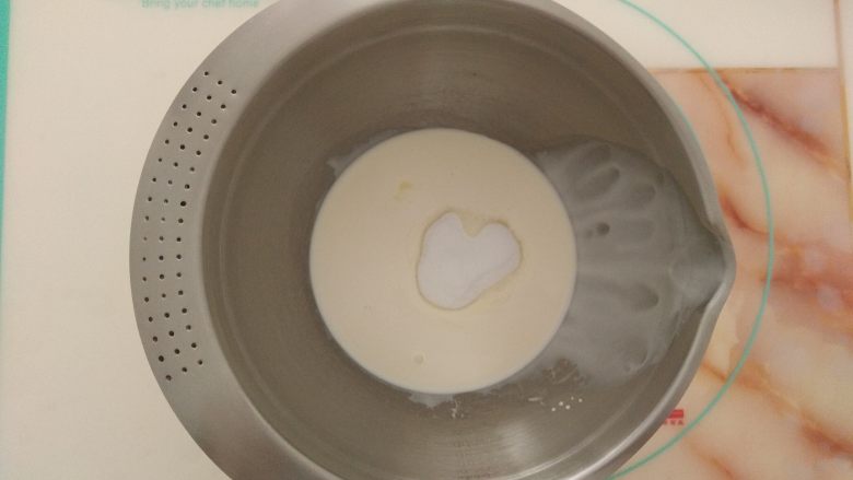 3. 泡软的吉利丁片放在杯中隔水加热至融化。