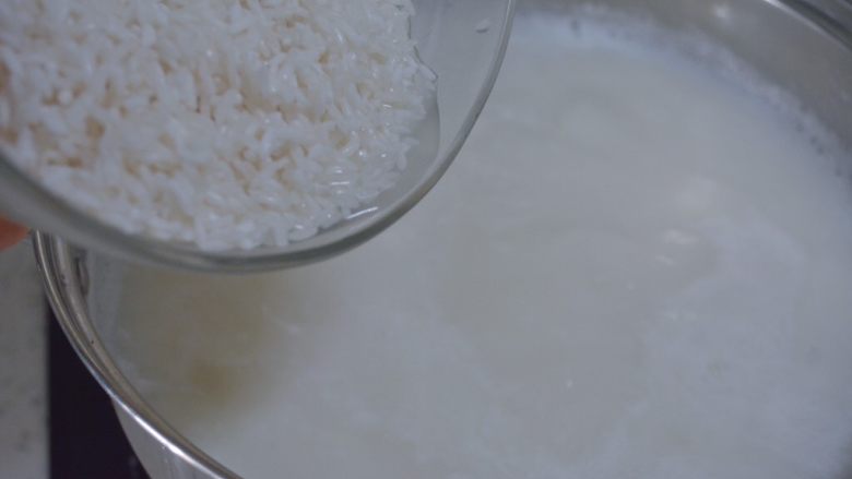 13. 把洗好的米倒入煮开后过滤掉泡沫的豆浆里。