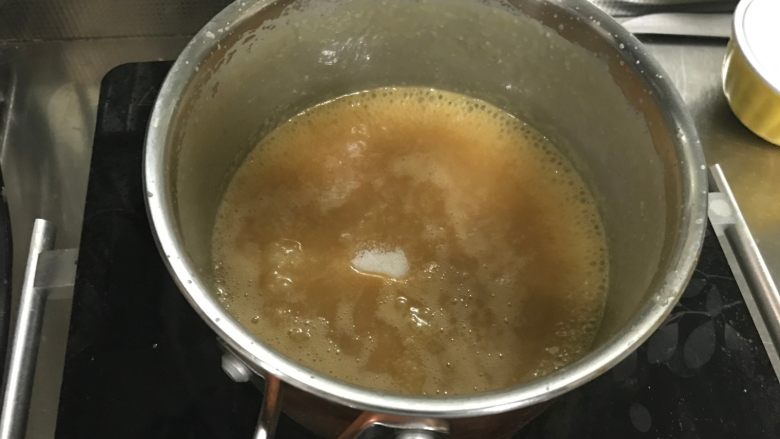 3. 开中火加热砂糖和水,糖水煮开后转小火(此时开始加热鲜奶油)