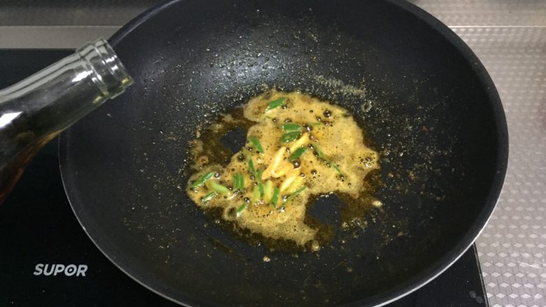 6. 接着来处理虾头,锅中倒入适量油,烧热下虾头,虾出虾油,炸至虾头金黄,如图,关火,夹出虾头,留虾油在锅中