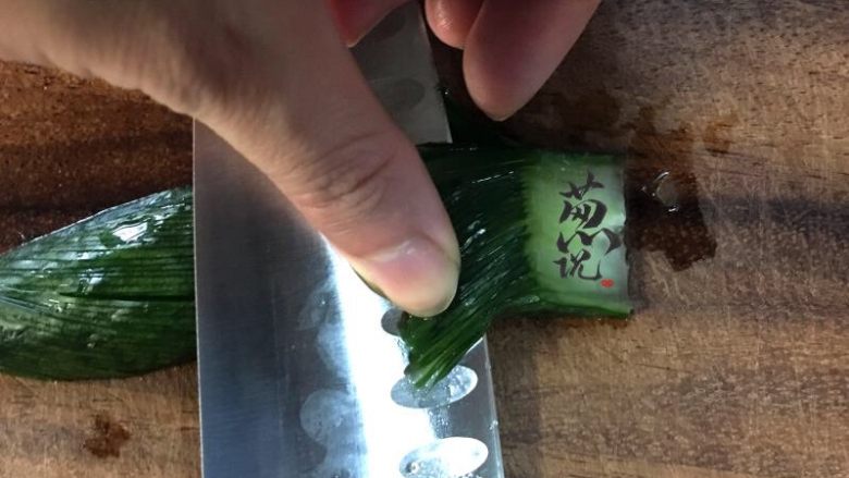 5. 刀再向左移2cm,斜切,切断,同时拇指将黄瓜推向另一边。最终呈现如图的效果。将切好的黄瓜置于容器中备用。