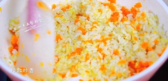 8. 炒30秒后加入米饭,柚子妈的熟米饭是大米、小米、藜麦三者煮成的。