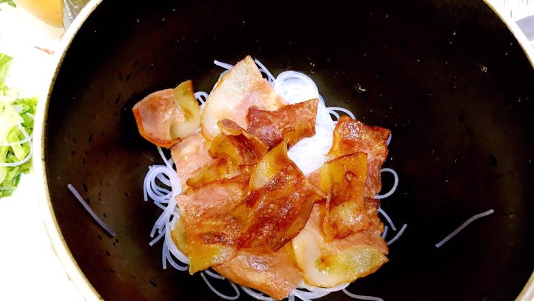 6. 粉丝剪段放入容器中,煎好的培根切段