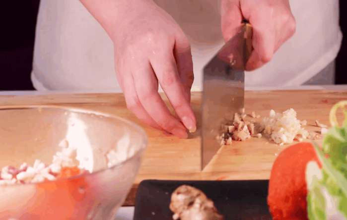 1. 首先将所有食材准备后,我们先来切肉,将肉剁成肉糜备用。