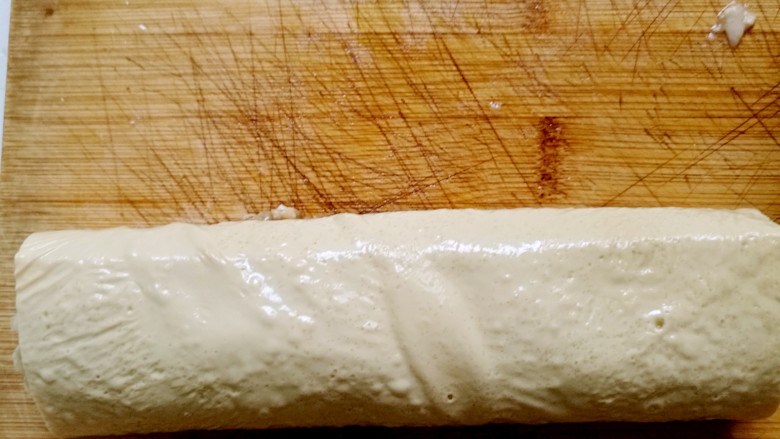 5. 卷起来(不太好卷,一卷铺平的肉沫就往前移,还不能抹太多了,因为切的时候肉沫会挤出来,我也是第一次做,做得不好看)
