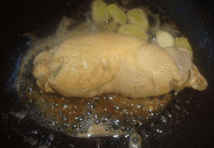 9. 然后放入姜蒜片,爆香后,下鸡腿卷,煎。