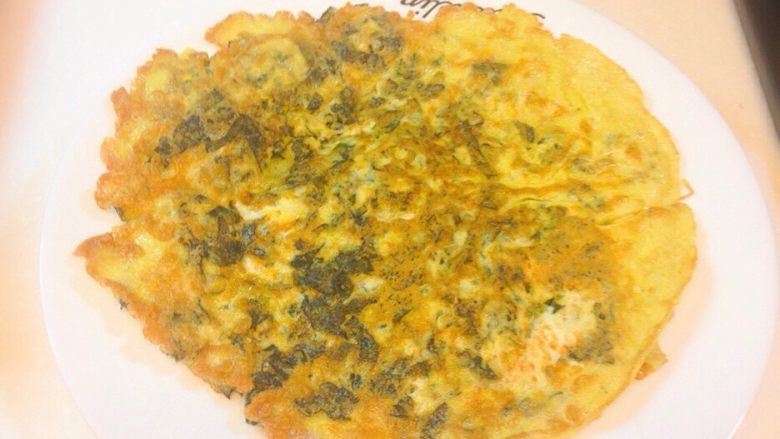 5. 平底鍋放少油,倒入蛋液後用筷子或湯匙調整紫蘇分佈,平均厚度咬下才會酥脆不硬