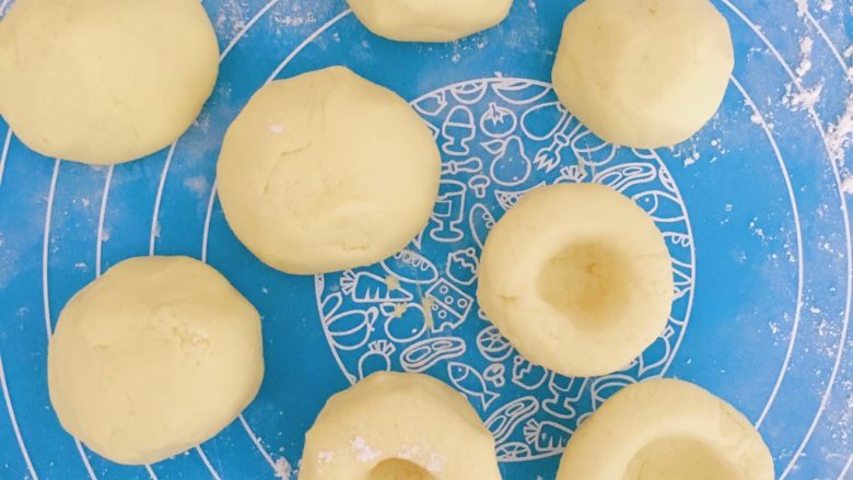 10. 将分好的小剂子放置掌心揉成小圆球 (乒乓球大小)底部用大拇指压出小坑呈帽子状