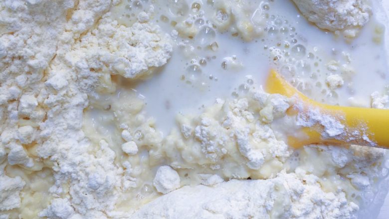 4. 将搅拌均匀的配方奶倒入面粉中先用刮刀进行搅拌均匀