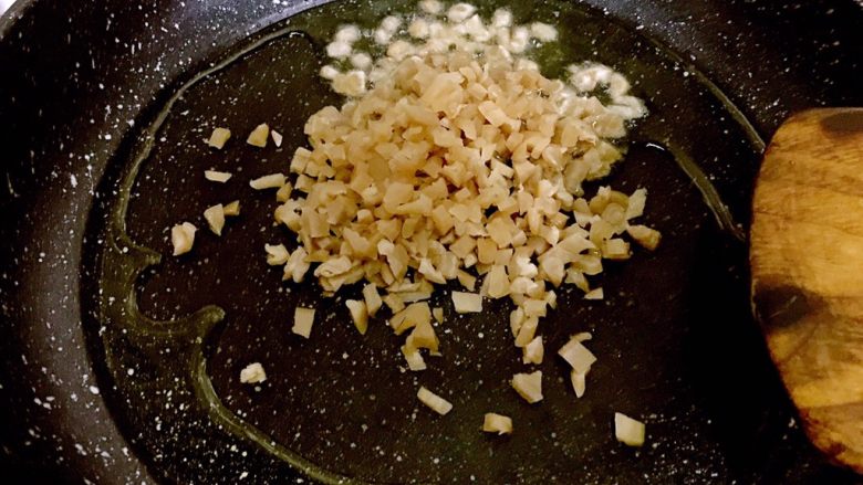 7. 油热后倒入萝卜干末