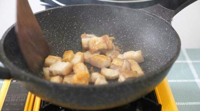 5. 锅内水倒掉,留下瘦肉,炸出肥油,炸到肉微黄,盛出