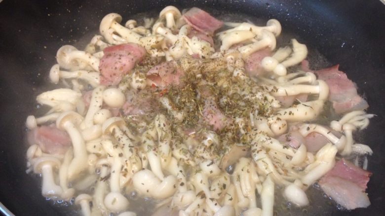 11. 看到差不多香菇軟熟了,加入適量義式香料和少少的黑胡椒調味,培根原味還是有鹹,所以鹽巴只要一點點