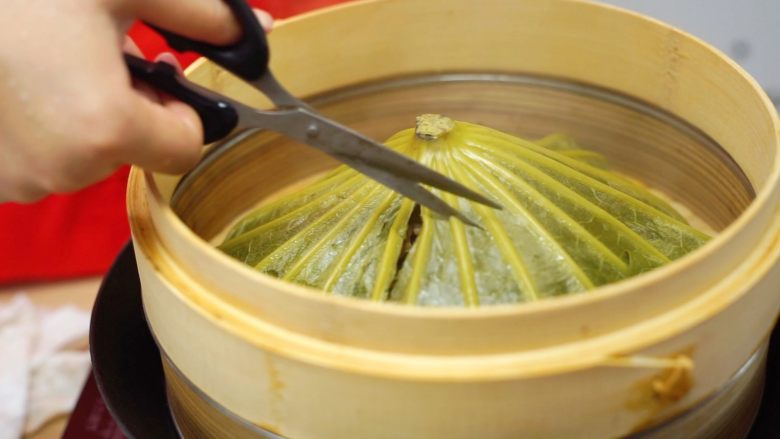 12. 用剪刀把荷叶剪出一个口子,如果是小蒸笼,可以直接连蒸笼上桌食用哟~这里用的大蒸笼,所以剪开装盘~