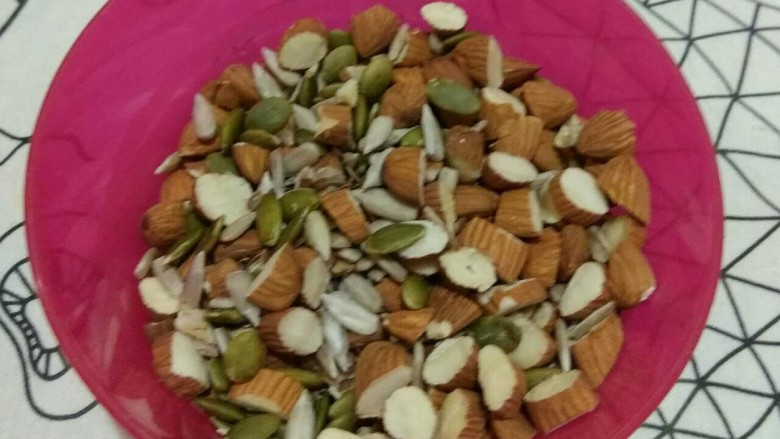 - 坚果的话我最爱用杏仁,烤完很香,还有核桃。还可以多放掉葵瓜子、南瓜子这样的便宜又好吃的果仁(加南瓜子颜色搭配好看),另外非常推荐亚麻籽和芝麻,烤起来非常香!