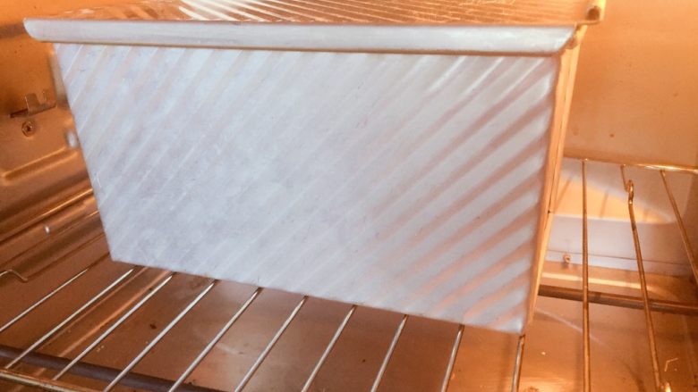 17. 面团发到吐司盒8分满时盖上盖子,此时烤箱预热180度10min