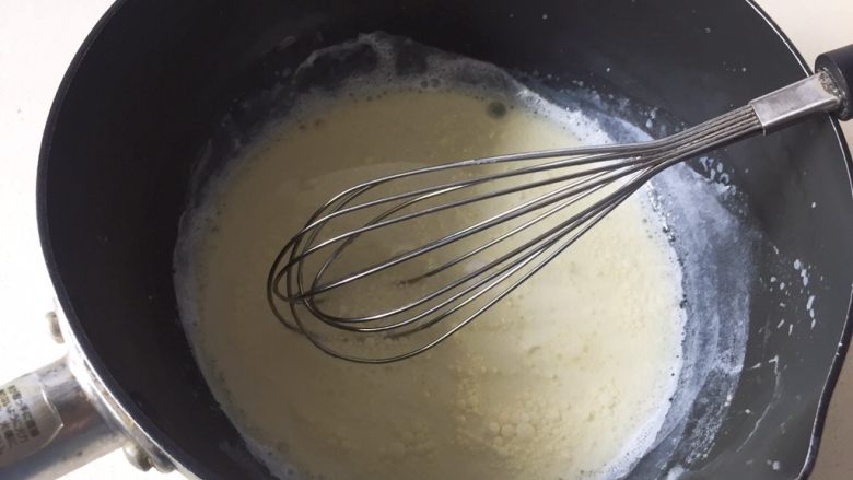 13. 加入植物油手动蛋抽搅拌均匀,多搅拌一会,让牛奶和奶油完全融合,表面看不到油花。