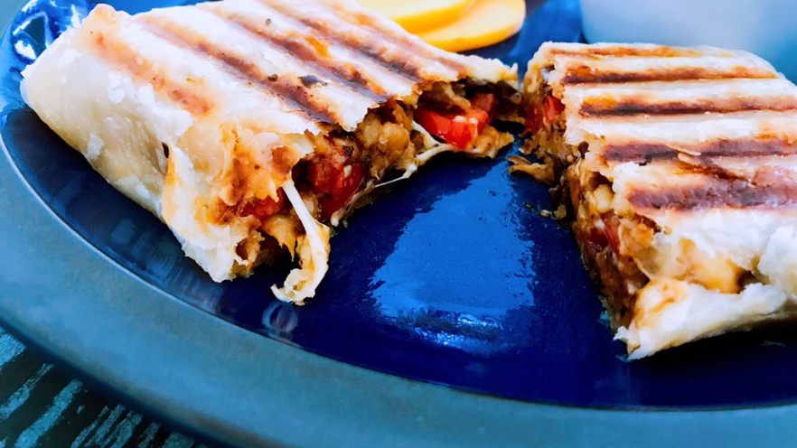 8. 然後將早餐餅拿出來,把混合好的茄子餡填充到餅里,把餅的四邊折疊把餡包在中間。