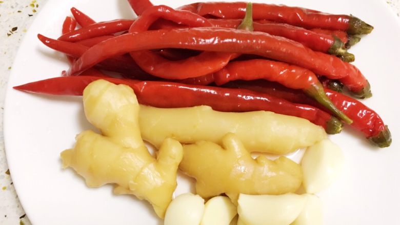8. 放入泡椒泡姜大蒜炒香,可以用小火慢炒,炒香所有配料,如图所示。