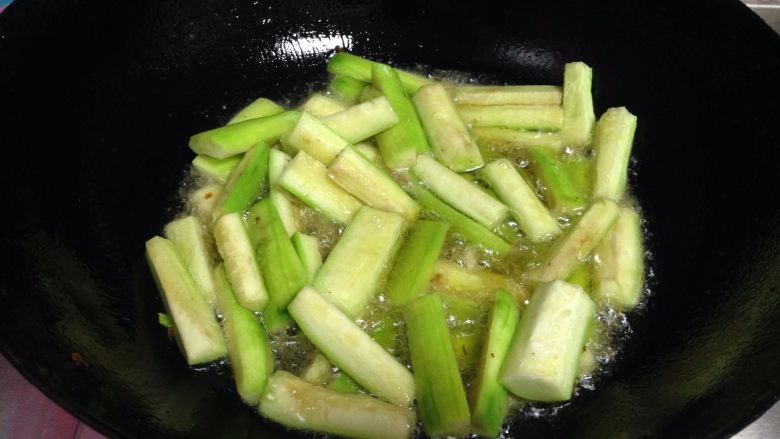 12. 锅内烧油,大火五、六成热将油条段放入炸到酥脆金黄