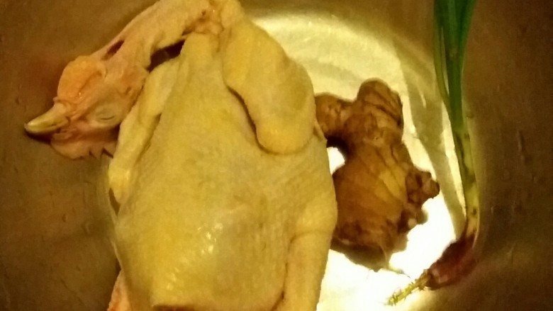 7. 放清水烧开,水量最好能没过鸡身,放入两片姜和一段葱白,煮5分钟。