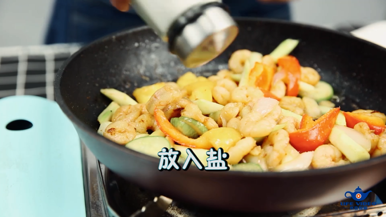 13. 翻炒1分钟后撒少许盐