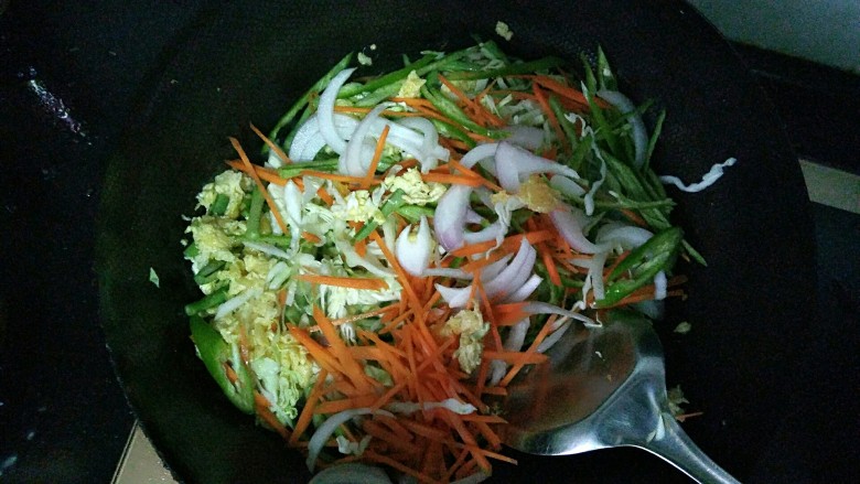 2. 胡萝卜、包菜、青椒、洋葱切丝,豆角切段备用
