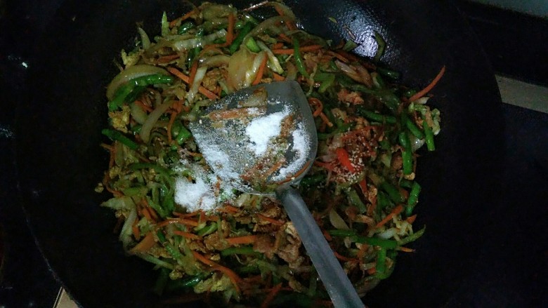 炒面,加入盐和<a style='color:red;display:inline-block;' href='/shicai/ 756'>鸡精</a>,继续翻炒几下