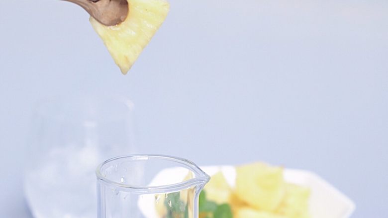 5. 往大的瓶子里加入凤梨,稍微捣碎