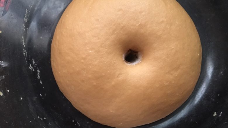 10. 手指沾干粉,在面团中间戳一个洞,洞口不回缩不回弹