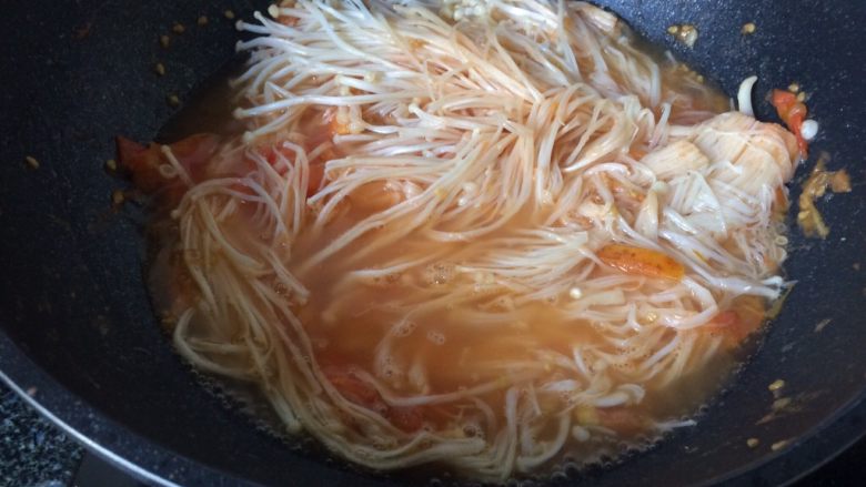 11. 等待番茄炒成浓稠的汁后加入金针菇