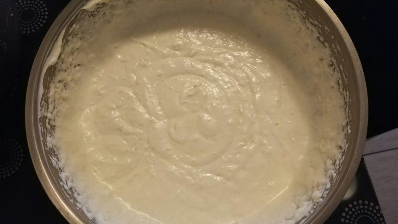 3. 淡奶油加糖粉60g打发成奶油状,再将奶酪糊加入,用打蛋器拌匀。