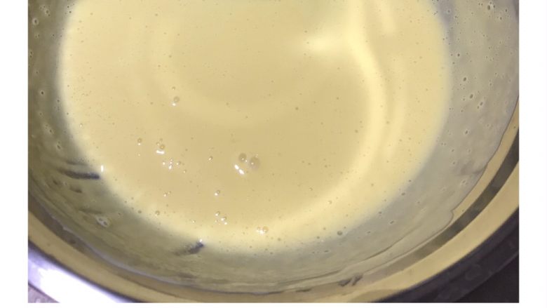 4. 隔水加热至烫手,放至不烫手后加入泡软的吉利丁拌匀备用