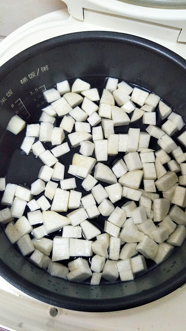 3. 首先我用电饭锅煮了一锅热水,水开后换成保温档,倒入切好的杏鲍菇。
