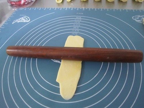 18. 拿起一个擀卷好的面团在中间按一下,使2端向上翘起