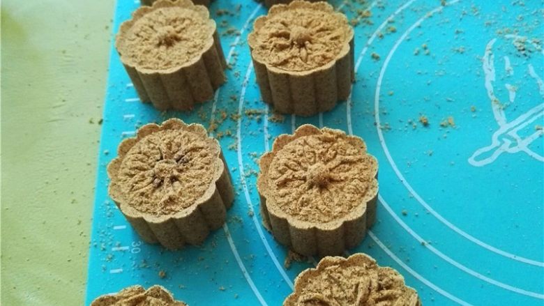 10. 月饼模具洒上点熟绿豆粉磕出,然后放入部分绿豆粉压实,中间留出放馅料;
