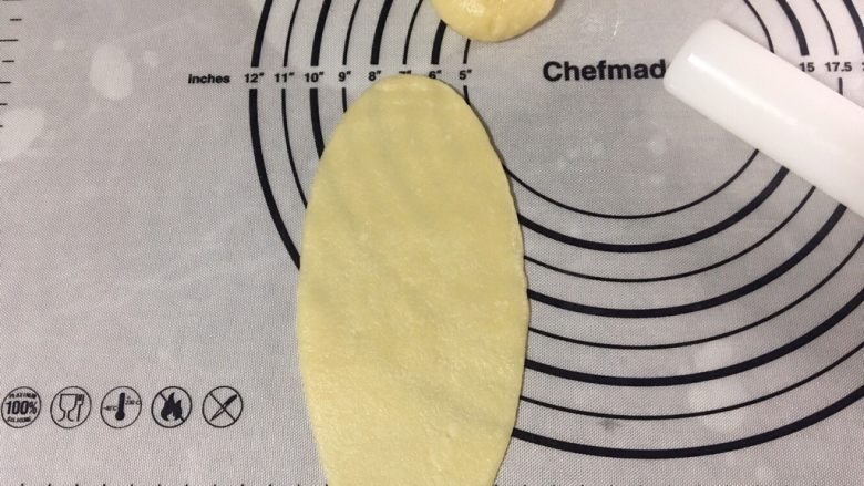 8. 将松弛好的面团第一次擀开,擀成长舌状。擀的时候注意轻些,以免破酥了。