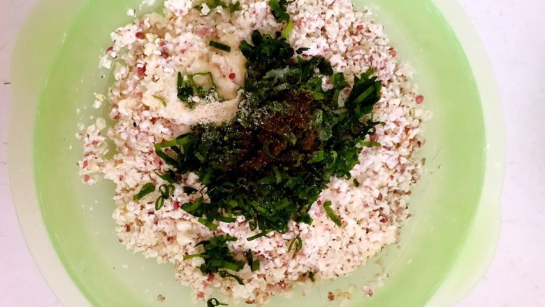 5. 在玉米碎中加入葱花,精盐,花椒粉和大豆色拉油