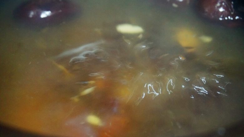 4. 砂锅内倒清水,将桃胶,红枣下入锅中,大火烧开后转为小火,煲制时间1.5-2个小时