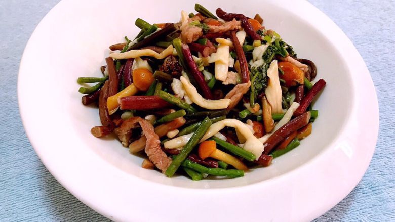 7. 放入蕨菜和杂蘑大火快速翻炒
