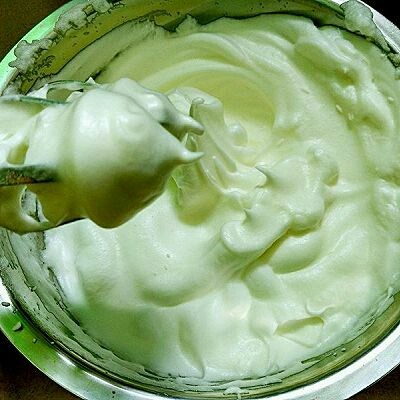 11. 取1/3蛋白霜放入菠菜糊,从下往上翻拌或#字翻拌,不可圈拌以免消泡。