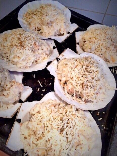 14. 把搅拌好的酱铺在扇贝上,再撒上奶酪些许,再撒些俄利岗叶