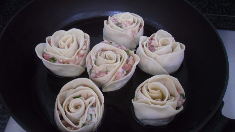 17. 烧热平底锅,倒入少许食用油,将玫瑰花饺子平铺在锅内,中火煎5-8分钟左右定型,至底部焦黄色