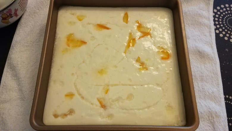 4. 将奶糊倒入活模中,将柚子蜜糊淋在表面。