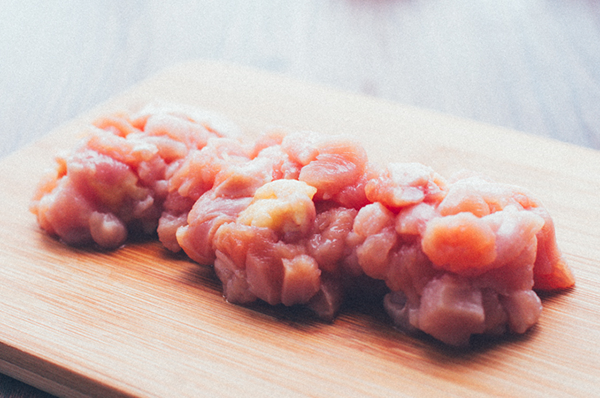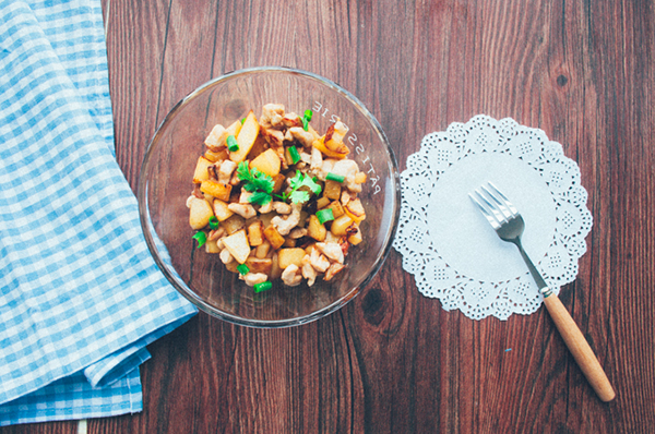 5. 土豆丁冲水去除多余淀粉,放入土豆丁到炒锅,开始边边有软了的迹象就放鸡丁