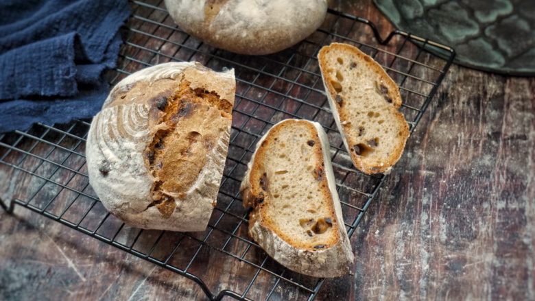 20. 醒发好后将面包篮里的面团倒扣在烤盘里,用剪刀剪开,撒上面粉