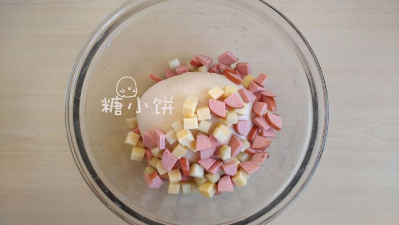 4. 揉好的面团加入步骤2准备好的辅料丁轻轻揉匀