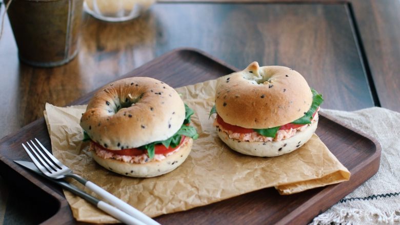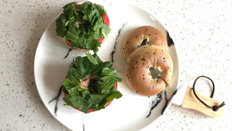 三文鱼加奶油奶酪是面包圈三明治的经典,这次我是用自己烤制的三文鱼肉制作的,新鲜的鱼肉,加上番茄的酸味以及菠菜的青甜味,绝对是一种非常神奇的调味组合。