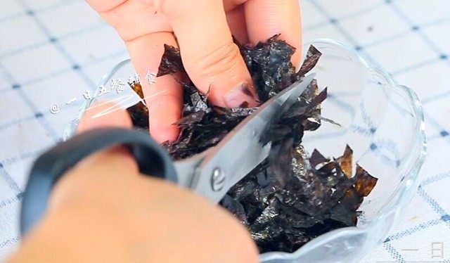3. 海苔剪碎。 🌻小贴士:剪的心累,下次我要用料理机打成粉加进去,解放放手,最后切的时候还平整。