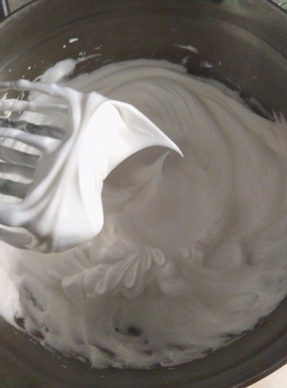 9. 糖分三次加入到蛋白中,将蛋白打至提起打蛋器有长的尖角状。我没有打到小直角的状态
