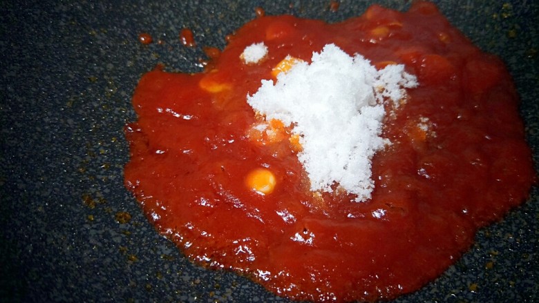 16. 然后放入白糖 白糖和番茄酱的比例是1:2。 (可以根据自己的口味改变比例,我觉得这个比例是很好吃的)